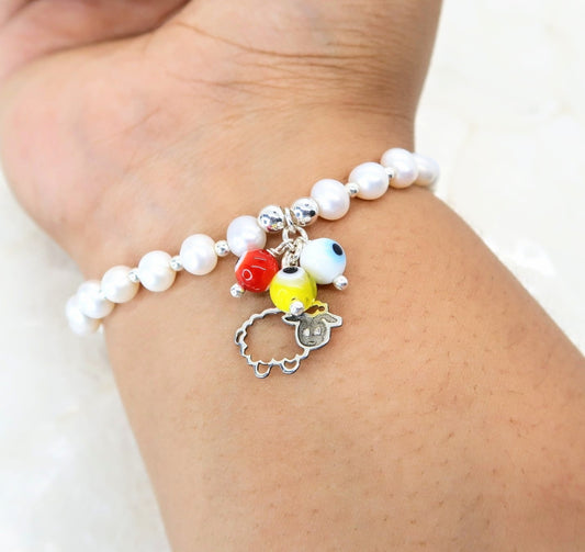 Pulsera Borreguito de la Abundancia, Ojito turco y Perla Cultivada